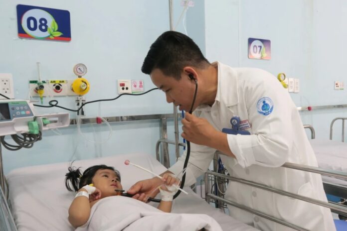 Bác sỹ Bệnh viện Nhi đồng 1 Thành phố Hồ Chí Minh, khám cho bệnh nhi mắc tay chân miệng. (Ảnh: Đinh Hằng/TTXVN)