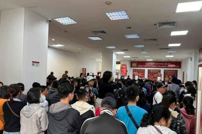 Tại “phố vàng” Trần Nhân Tông (Hà Nội) nhiều cửa hàng kinh doanh vàng bạc ghi nhận cảnh người dân xếp hàng dài trên vỉa hè từ rất sớm để chờ giao dịch vàng.